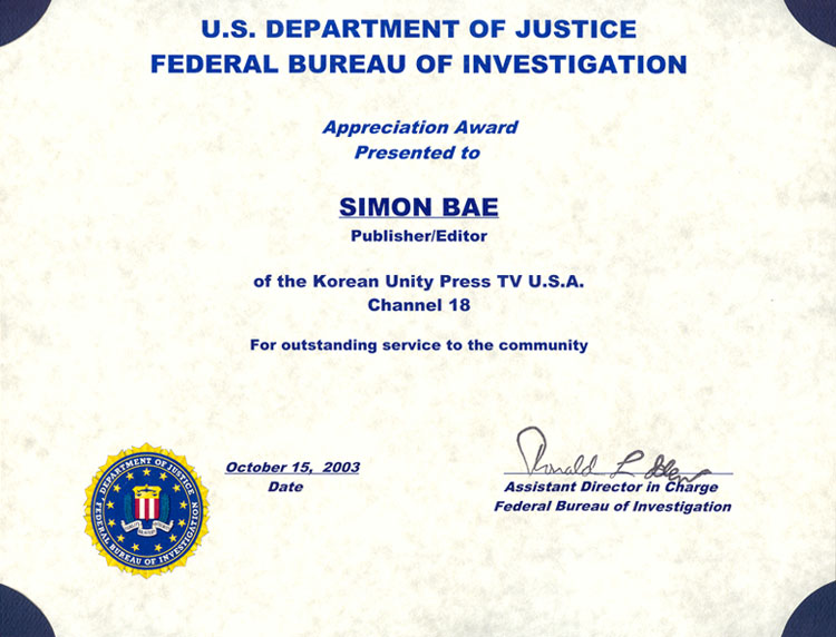 10¿ù 23ÀÏ ¹Ì±¹ ¿¬¹æ¼ö»ç±¹ (F.B.I.) ¼ºÎÁö±¹Àº ¹ÌÁÖÅëÀϽŹ® TV ¹æ¼Û Ch.18 °³±¹À» ±â³äÇÏ¸é¼ º»»ç ¹èºÎÀü(Simon Bae) ¹ßÇàÀο¡°Ô Ä¿¹Â´ÏƼ ºÀ»ç»óÀ» ¼ö¿©Çß´Ù.