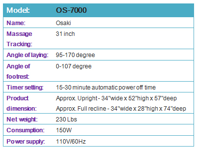 | Extra Long Vertical massage range - Most massage chairs are limited to 29 - 30 inches in vertical motion. The OS-7000 boasts a 31 inch range, reaching the lower tailbone area. |